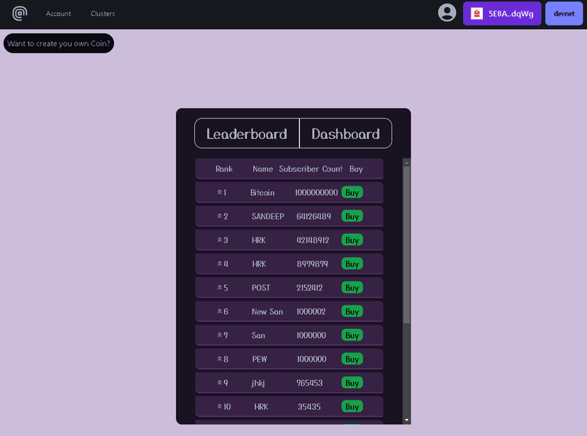Youtube Opinions market dapp running on Solona blockchain which lets youtubers create their own coin and let people buy the coins and support the creators. Users can trade and the value of a coin fluctuates based on supply and demand.